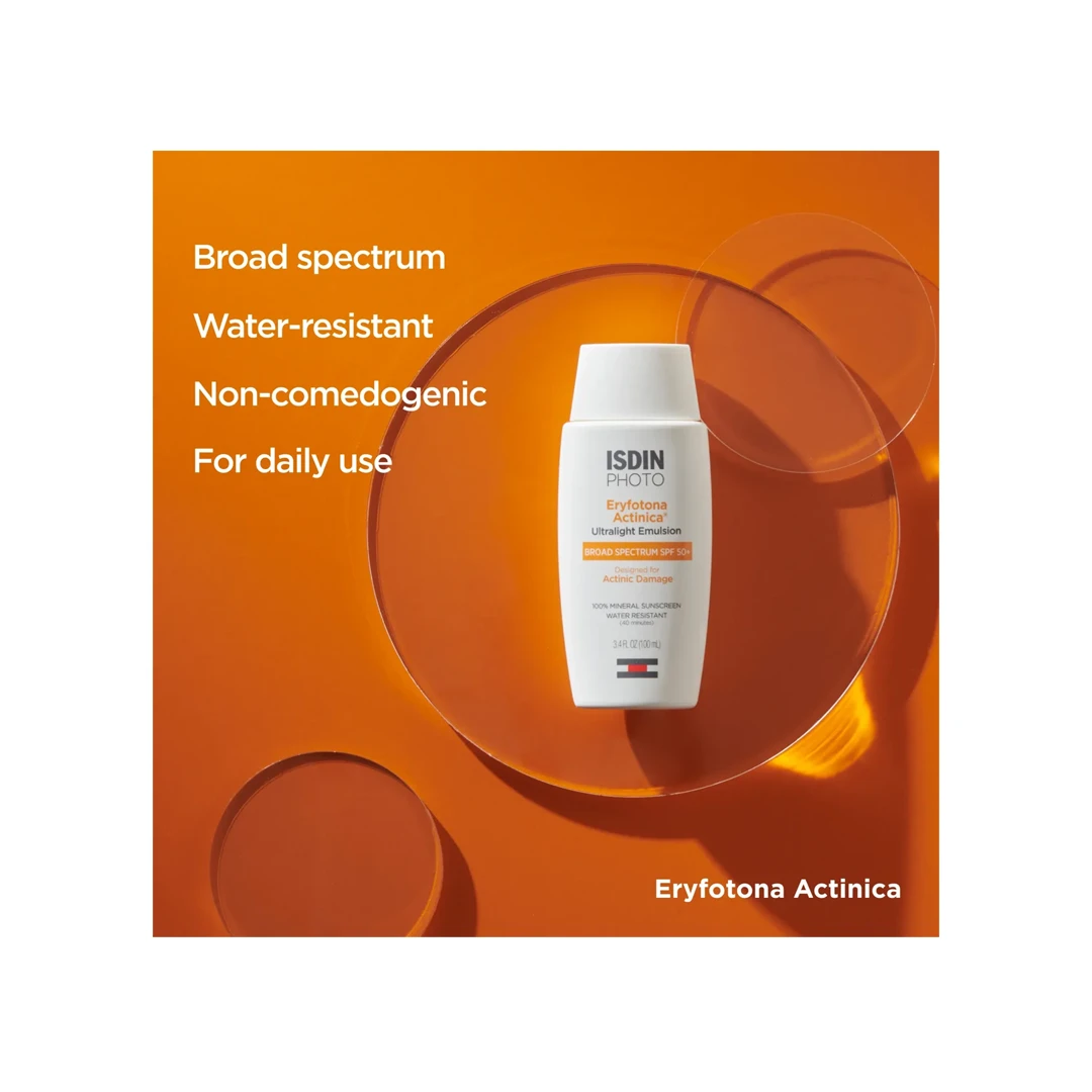 Eryfotona Actinica is an ultralight, fast-absorbing emulsion providing all-mineral broad spectrum sun protection for daily use.