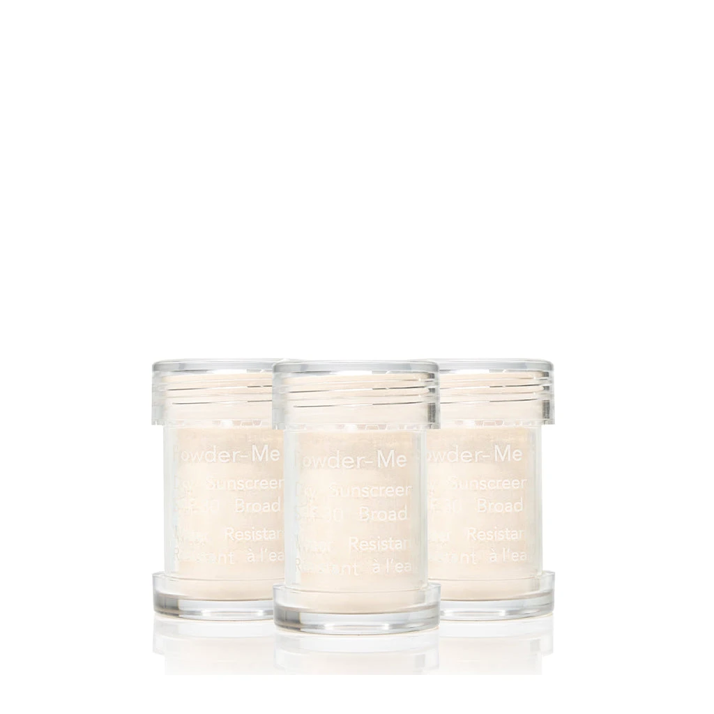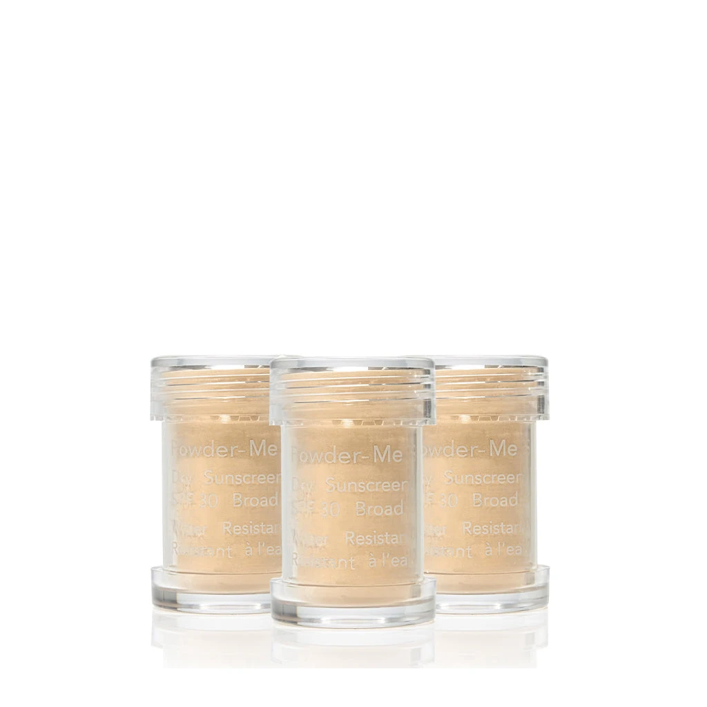 Three fully recyclable refill canisters for your Powder-Me SPF 30 Dry Sunscreen brush. Weightless, dry, physical broad spectrum sunscreen for face, body and scalp. Wear alone or over makeup.