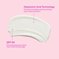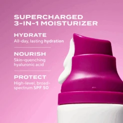 Our bestselling formula, reimagined. This 3-in-1 multitasking moisturizer delivers all-day, dewy hydration supercharged with hyaluronic acid tech to quench layers deep for plump + bouncy skin, plus high SPF 50 sun protection in 1 step