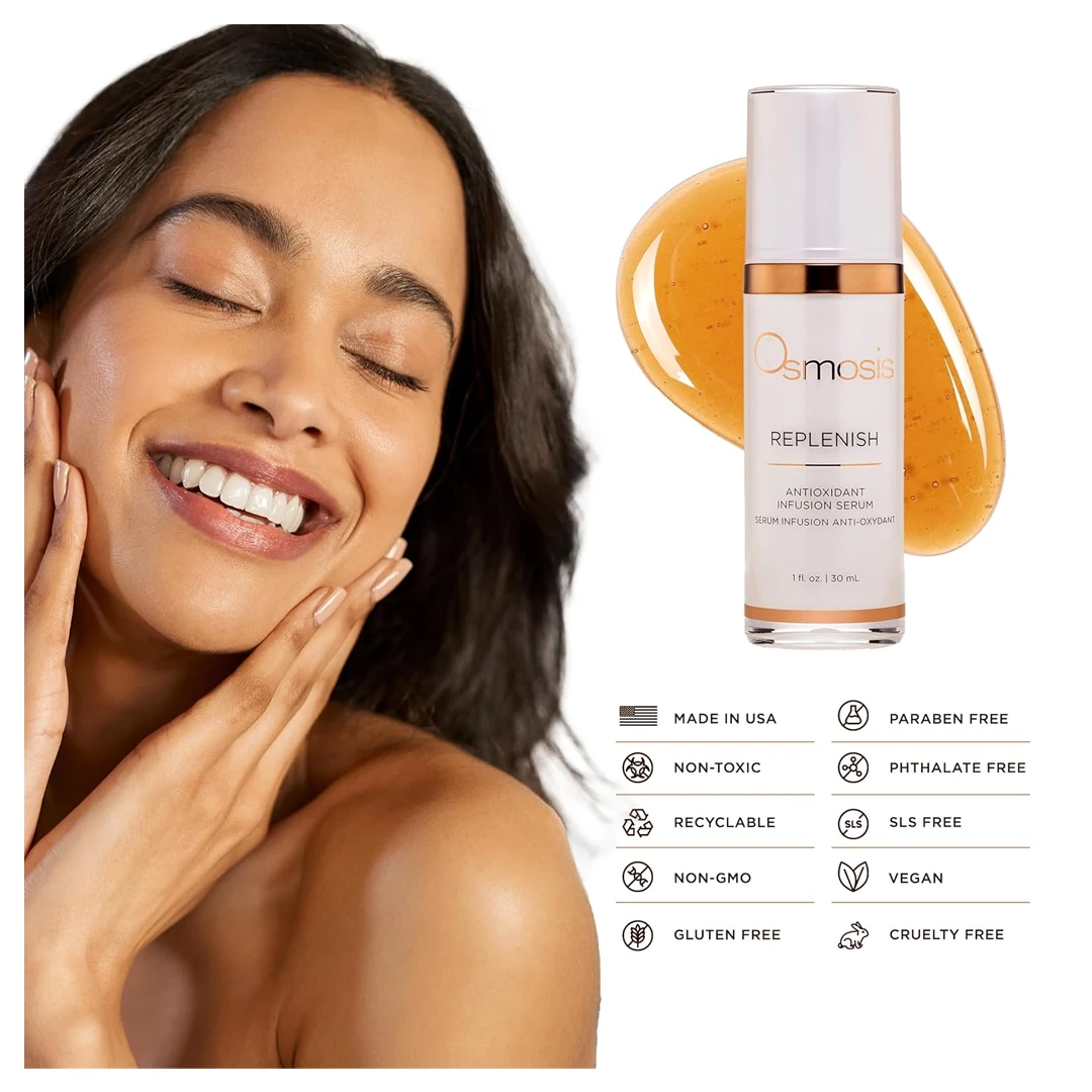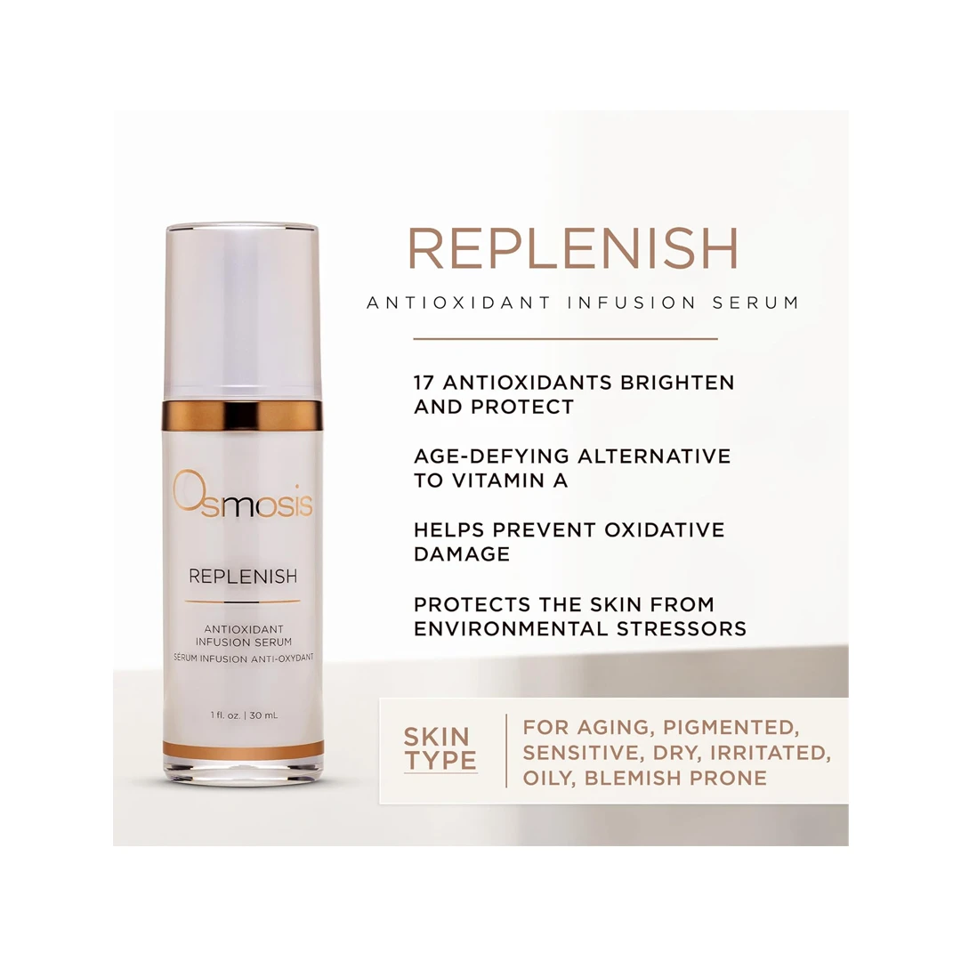 Unlock the age-defying secrets of Replenish Antioxidant Infusion Serum. This exceptional infusion of high-potency antioxidants combats the environmental effects of aging, from sun exposure to pollution, ozone, and smoke. This remarkable anti-aging formula empowers you to prevent sun damage, deeply hydrate your skin, and target collagen for a brighter, firmer complexion.