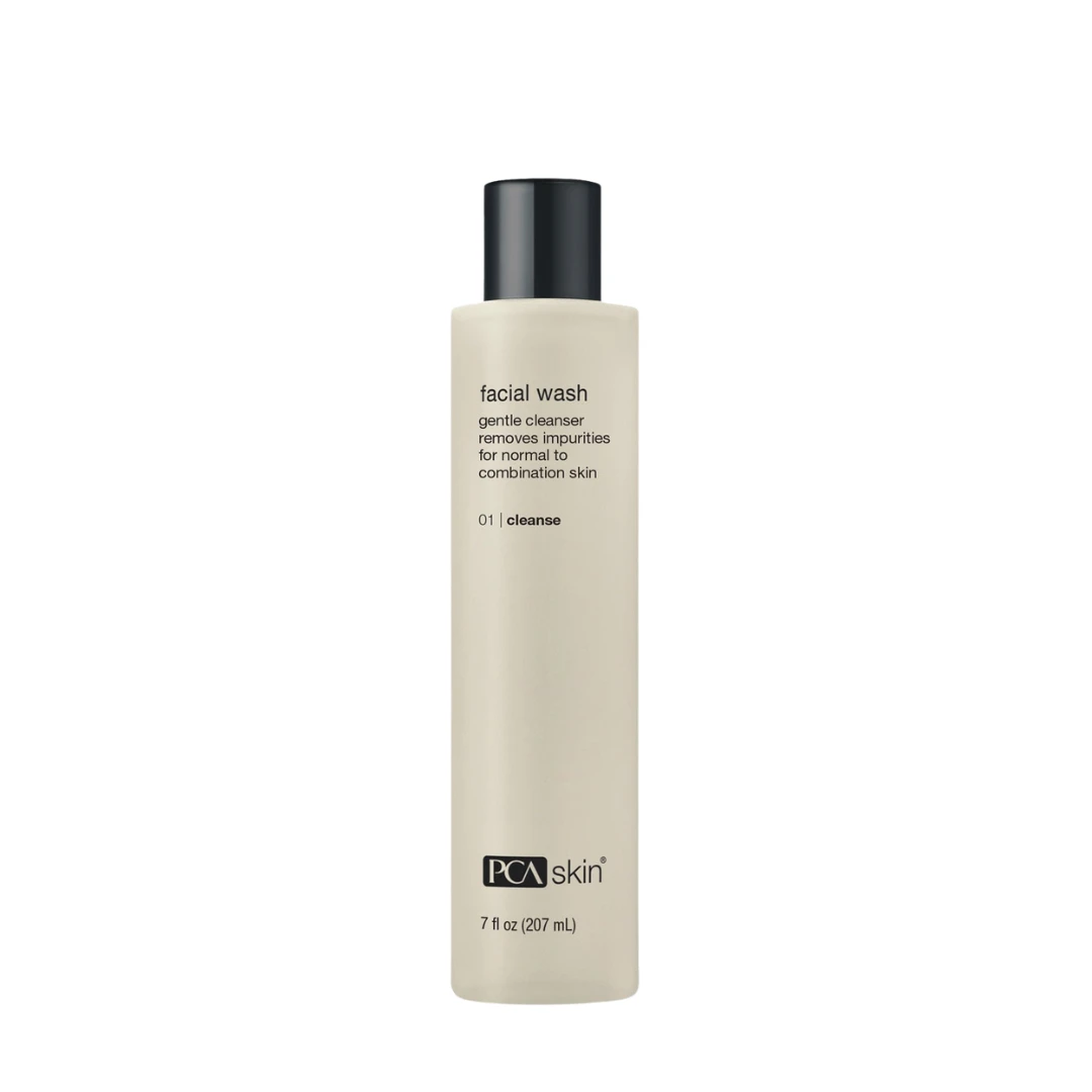PCA Skin Facial Wash is a gentle cleanser that removes stubborn makeup, excess oil, dirt, and environmental impurities with ease. The Facial Wash works to hydrate and gently exfoliate the skin while cleaning leaving behind a smoother, more polished appearance. Ingredients such as Aloe Vera Leaf Juice and Allatoin work to soften and soothe the skin as well as guard against the signs of future aging from forming on the skin. The Facial Wash is ideal for those with normal, combination, and sensitive skin and those with skin concerns pertaining to discoloration, visible signs of aging on the skin, as well as skin maintenance.Â