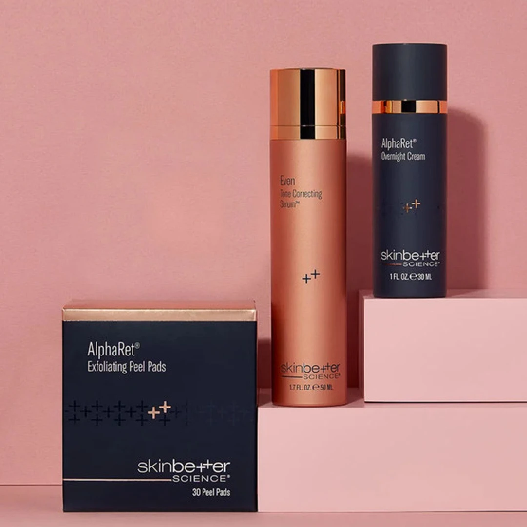 The Even Glow Regimen, featuring Even Tone Correcting Serum, AlphaRet Exfoliating Peel Pads and AlphaRet Overnight Cream, is designed for those specifically looking to address the appearance of brown, red, and yellow discoloration that can occur from sun damage.