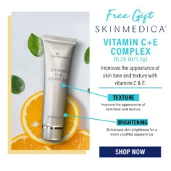 Give your skin a vitamin boost with SkinMedica’s Vitamin C + E Complex. Nourish your skin with this cocktail of antioxidants that protect against sun damage and free radicals to prevent premature aging. The properties of vitamin C brighten the skin for a healthy glow while stimulating collagen production to plump fine lines and wrinkles. Vitamin E helps the skin lock in moisture and fortify its barrier to provide added protection against sun damage.