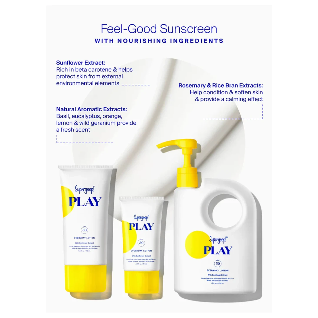 PLAY Everyday Lotion was created to correct everything you ever disliked about sunscreen. It feels amazing, it absorbs quickly and has a fresh scent, plus it’s never sticky or tacky. This was actually the first traditional sunscreen ever created without oxybenzone! PLAY nourishes your skin while it protects against UVA/UVB and infrared radiation, and it’s non-comedogenic so it won’t clog pores. This is our classic, original sunscreen lotion that’s been a beloved fan favorite for 15+ years — even kiddos enjoy applying it!
