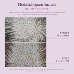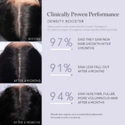 * Results reported after 6 months of using Flourish Shampoo, Conditioner and Density Booster regimen use in a double-blind, third-party clinical study of 35 women.