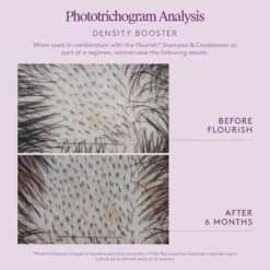 * Results reported after 6 months of using Flourish Shampoo, Conditioner and Density Booster regimen use in a double-blind, third-party clinical study of 35 women.