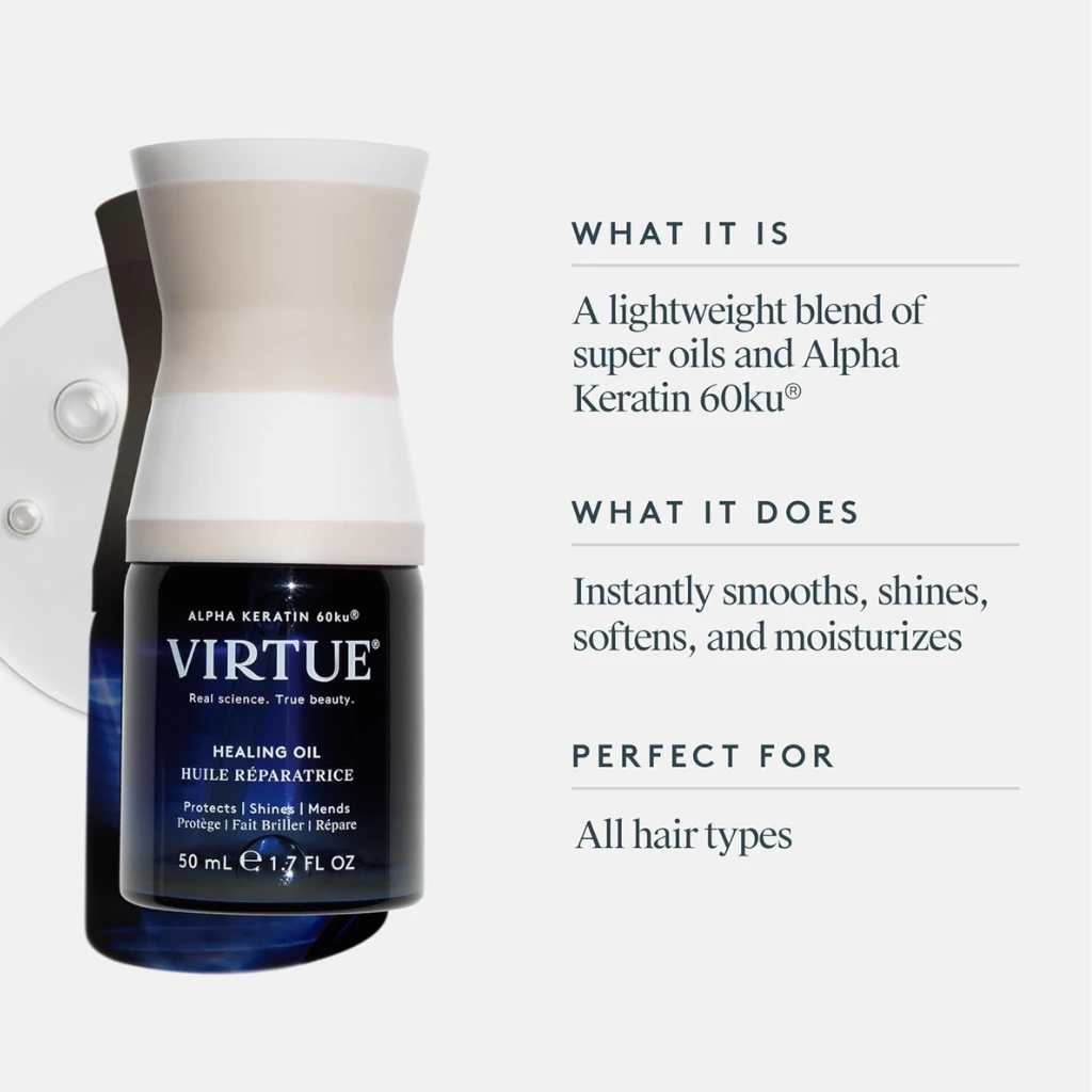 Virtue® Healing Oil is a first-of-its-kind blend of pure, hydrating oils and our powerful, reparative Alpha Keratin 60ku® protein in one bottle. Created with all hair types in mind, it’s the ultimate multi-tasker, delivering the shine, softness, and moisturizing you’d expect from a hair oil and the damage repair, strengthening, and environmental protection that only our human protein can provide. Healing Oil is formulated with clear oils, never yellow, so it glides on light and clean for a glossy finish that won’t alter your color or weigh down your hair. Color-safe, paraben-free, gluten-free, vegan.