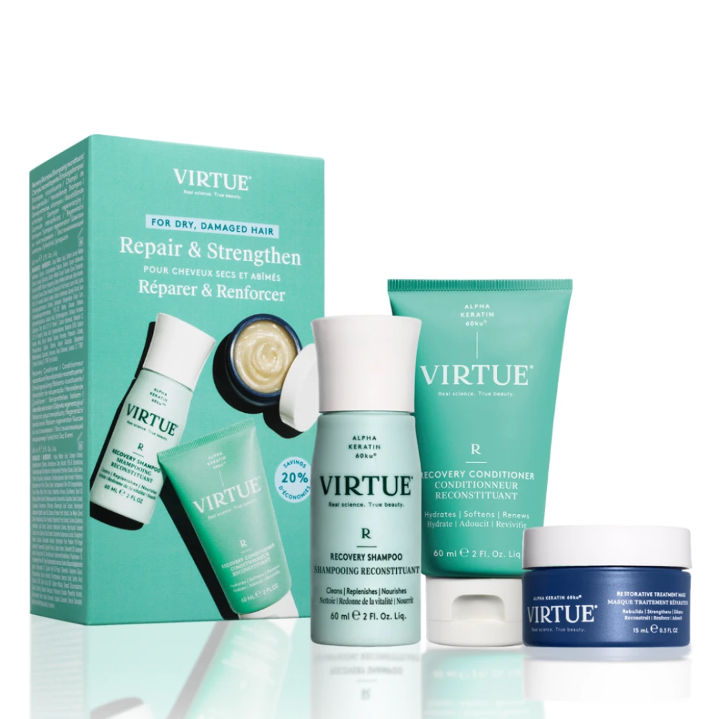 VIRTUE Recovery Discovery Set – Repair & Strengthen offers a simple regimen for hair healing.