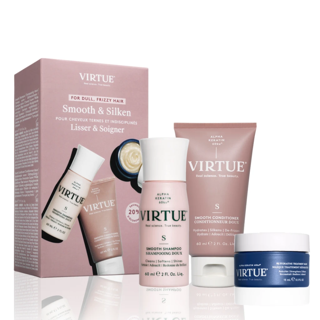 Achieve sleek strands and control frizz with the VIRTUE Smooth Discovery Kit – Smooth & Silken. Perfect for dull and frizzy hair, this kit refines, defrizzes, and deeply hydrates. Color-safe and vegan-friendly, itβs ideal for bringing your favorite VIRTUE products on the go or sampling their bestselling items. Infused with VIRTUE’s proprietary Alpha Keratin 60ku, this collection reduces frizz, repairs split ends, enhances thickness, and boosts color vibrancy. Experience a boost in hydration and overall hair health for a stunning, frizz-free look!